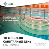 Уважаемые посетители, обращаем ваше внимание: 10 февраля (понедельник) - санитарный день в ВСЦ "Акватика". Бассейн работать не будет, а все залы будут работать в обычном режиме.