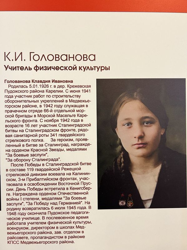 Клавдии Ивановны Головановой — ветерана Великой Отечественной войны, ветерана педагогического труда, ветерана карельского спорта, Почётного гражданина Медвежьегорского муниципального района.